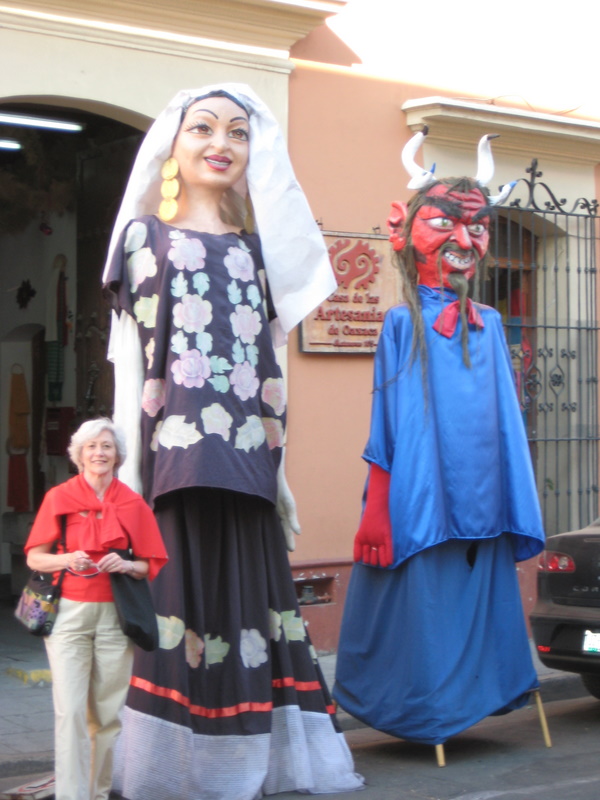 A few days later we were in this shop when wind tumbled these over. Later we saw figures like these in a parade.