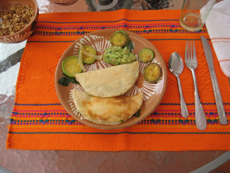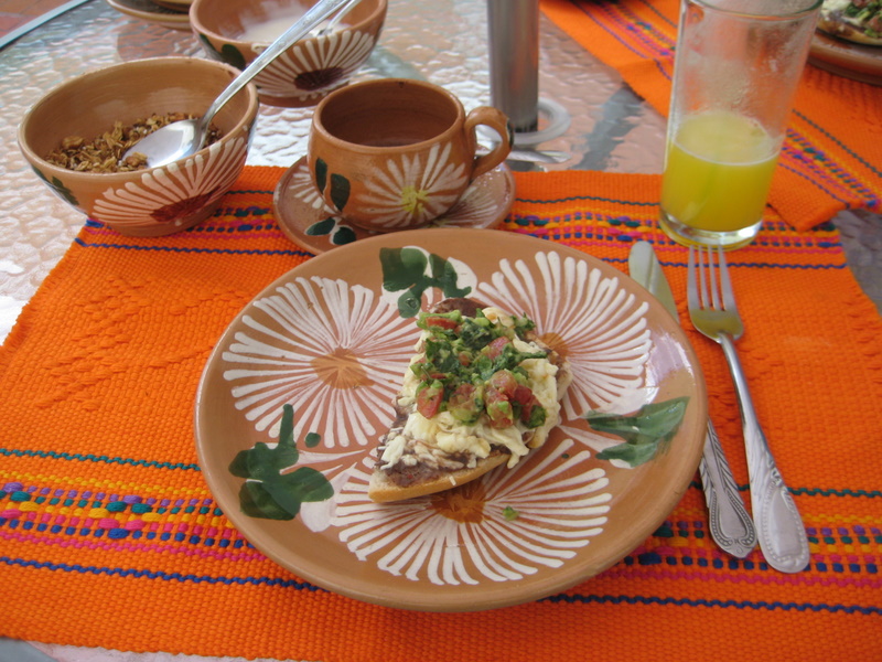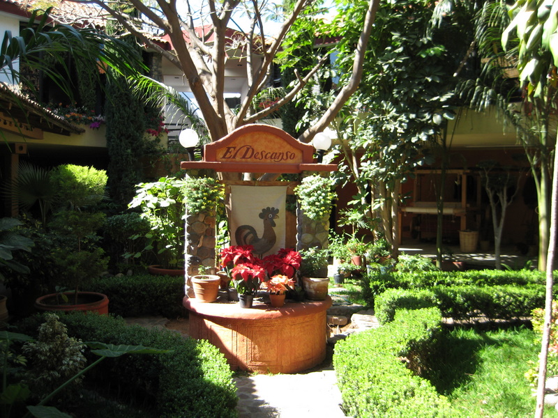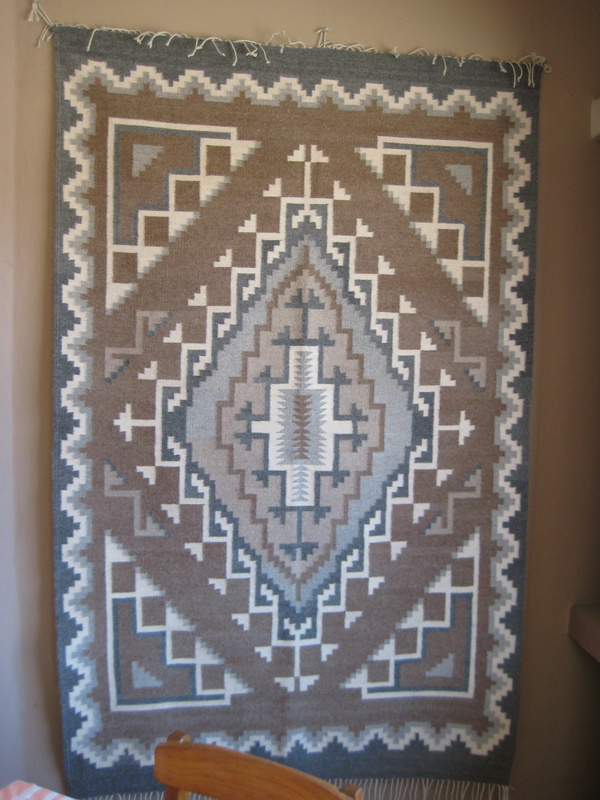 Weaving is one of the local crafts. Pat liked this rug in Teotitlan, a village known for its weavers. Below the courtyard of a restaurant there.